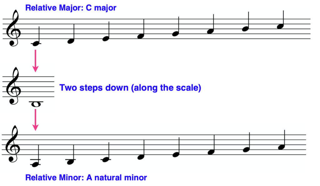 Relative major/minor scales are separated by two steps along the scale. For example, to find the relative minor of C major, you would start on a C, go back (or “down”) two steps along the C major scale, which lands you on A: